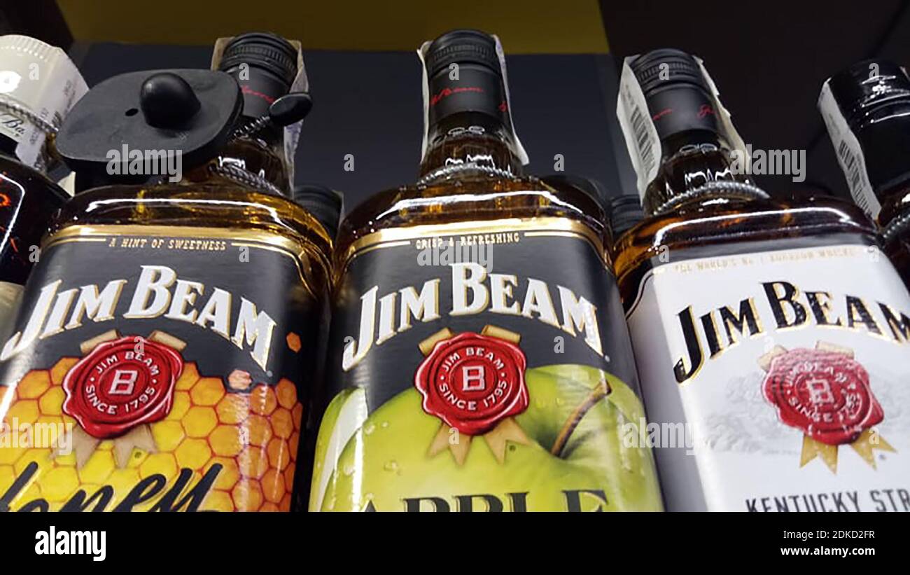 Whisky Jim Beam Bottle On Wooden Bar With Out Of Focus Pub Background Stock Photo Alamy
